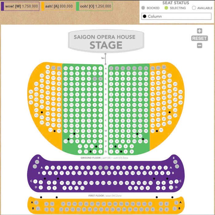 À Ố Show có 3 hạng ghế chính thức là ghế Aah [A], Ooh [O] và Wow [W]. Trong đó, ghế hạng phổ thông - ghế thường là ghế A nằm ở hai bên cánh của sân khấu. Vị trí ghế [O] nằm chính diện sân khấu, giúp bạn theo dõi trực tiếp các màn biểu diễn. Và hạng ghế tốt nhất là ghế [W] nằm ở tầng trên là vị trí bao quát nhất để theo dõi show diễn từ mọi góc độ.